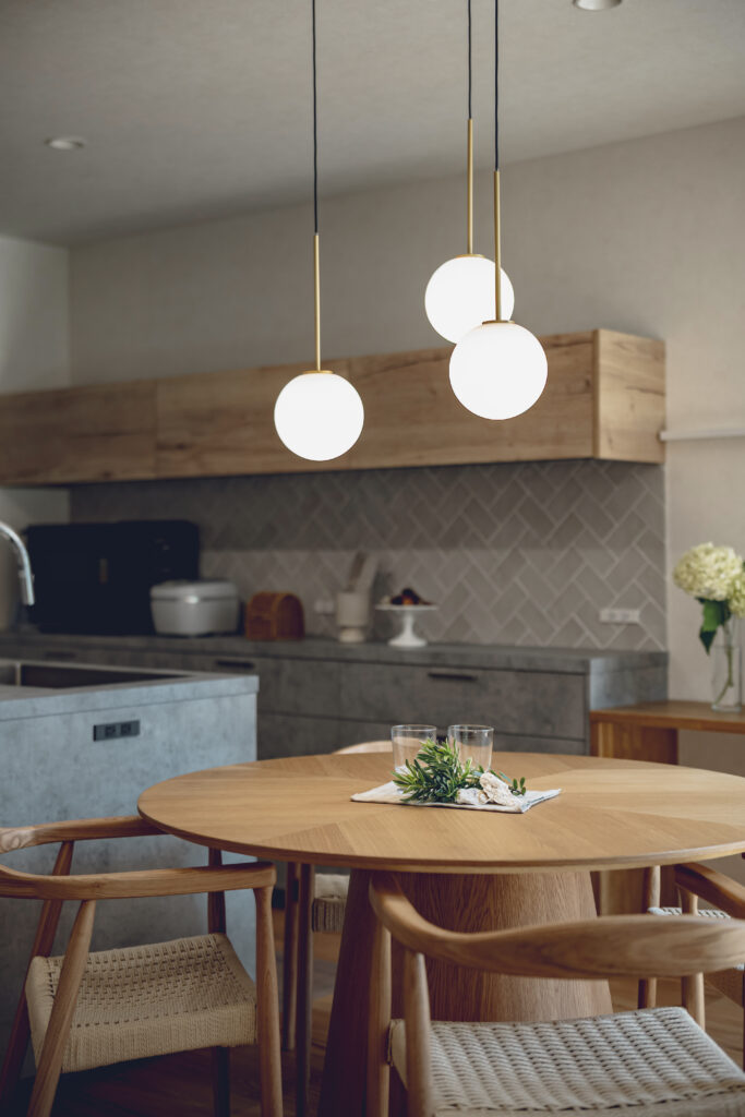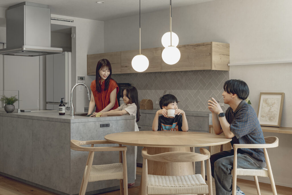 ダイニングに配置した丸テーブルは、家族の会話が自然に弾む場所に。