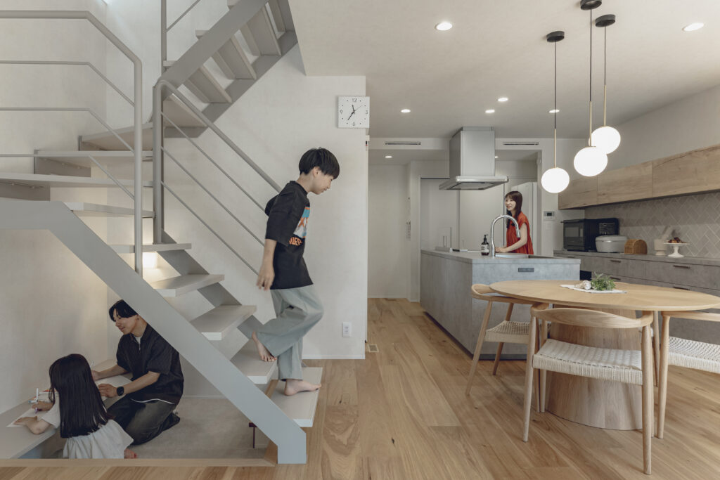 階段下のワークスペースは、家族が集まり、自然にコミュニケーションが生まれる場となっています。