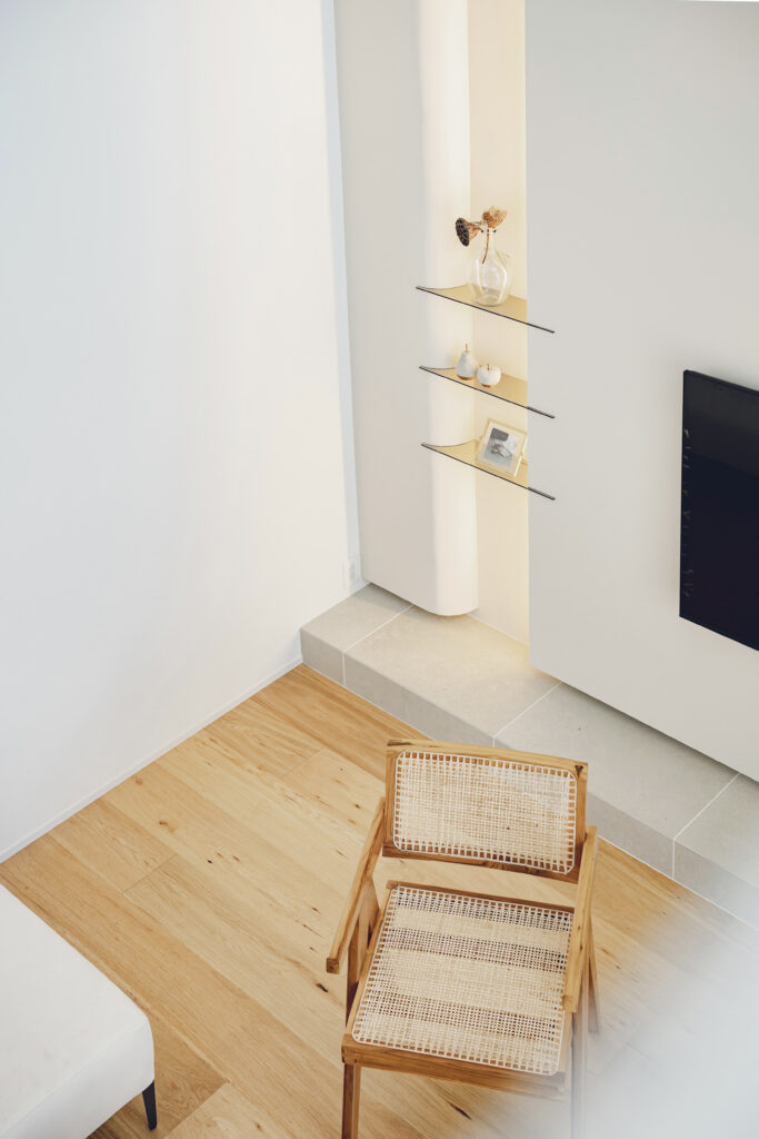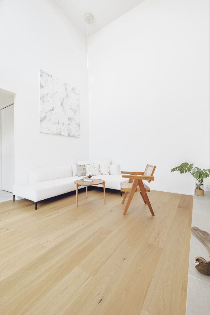 床にはオークの挽板材を使用し、TV面は、タイルと塗装仕上げで演出。質感の変化で見せるインテリア。