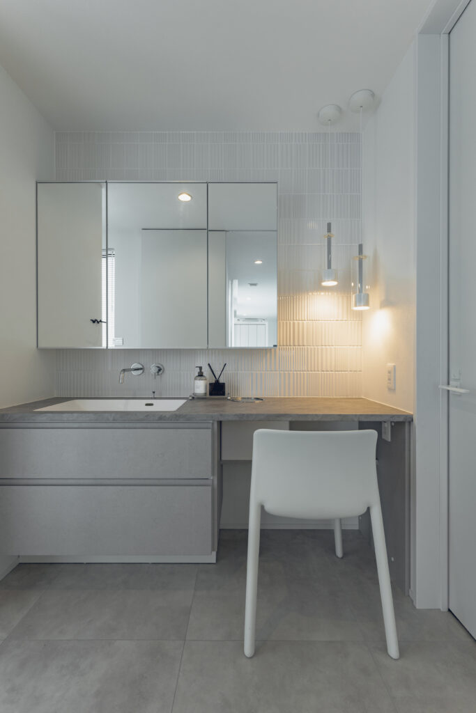 人気の洗面カウンターをベースに、お気に入りのタイルと照明で個性を演出。