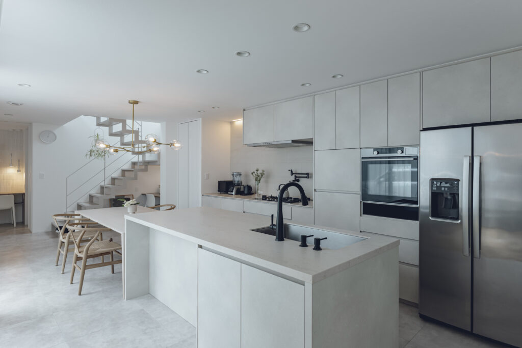 アイランド型のオーダーキッチンを中心に、視線が抜けるスムーズで開放的な動線を確保。ワークスペースや水まわりをつなぐ回遊動線で家事効率も向上します。鉄骨階段がアクセントとなり、シンプルでモダンな空間を演出しています。