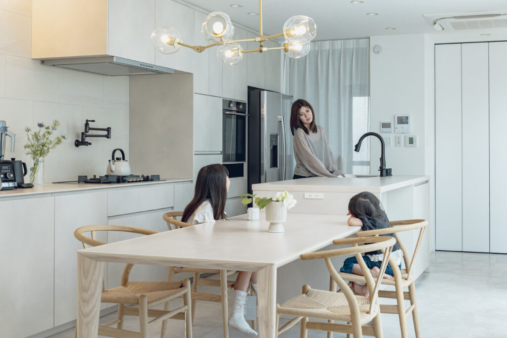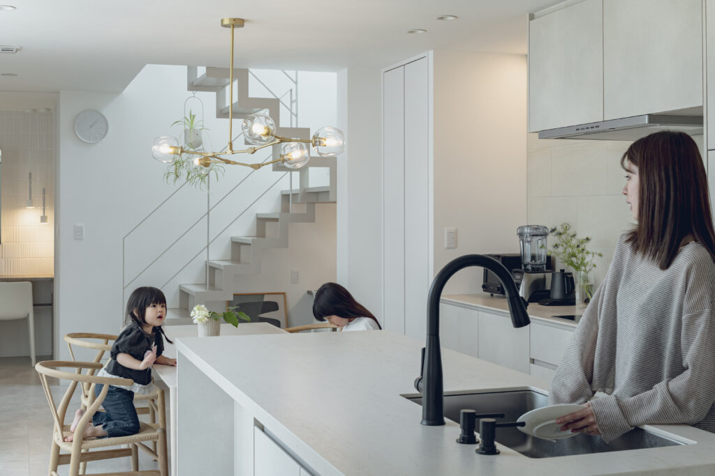 家族の気配を感じながら作業できるキッチンは、会話が弾む心地よい場となっています。